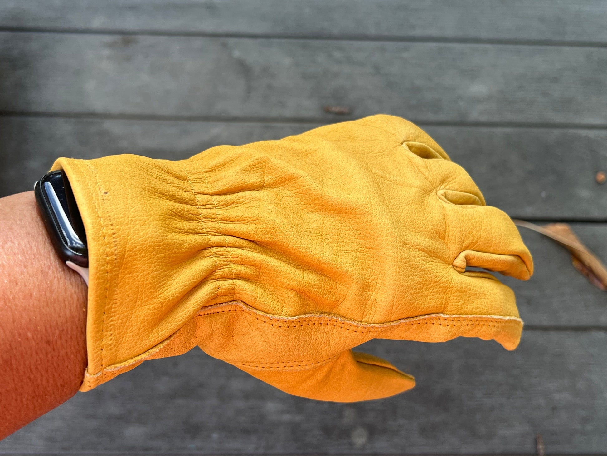 The shirred elastic back of the 426 Heavy Duty Gold Buffalo Leather Ranching Glove keeps debris out of the glove and provides a snug fit. This feature is especially beneficial for ranch and farm work, as it helps to keep dirt and other debris out of the glove, protecting your hands and keeping them clean.